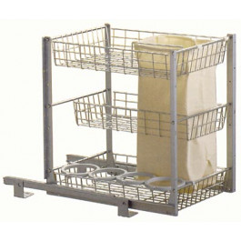 Cadre en métal laqué blanc et coulisses sortie simple. Paniers en fil blanc. Profondeur 456 mm, hauteur 485 mm. 3 niveaux + sac.